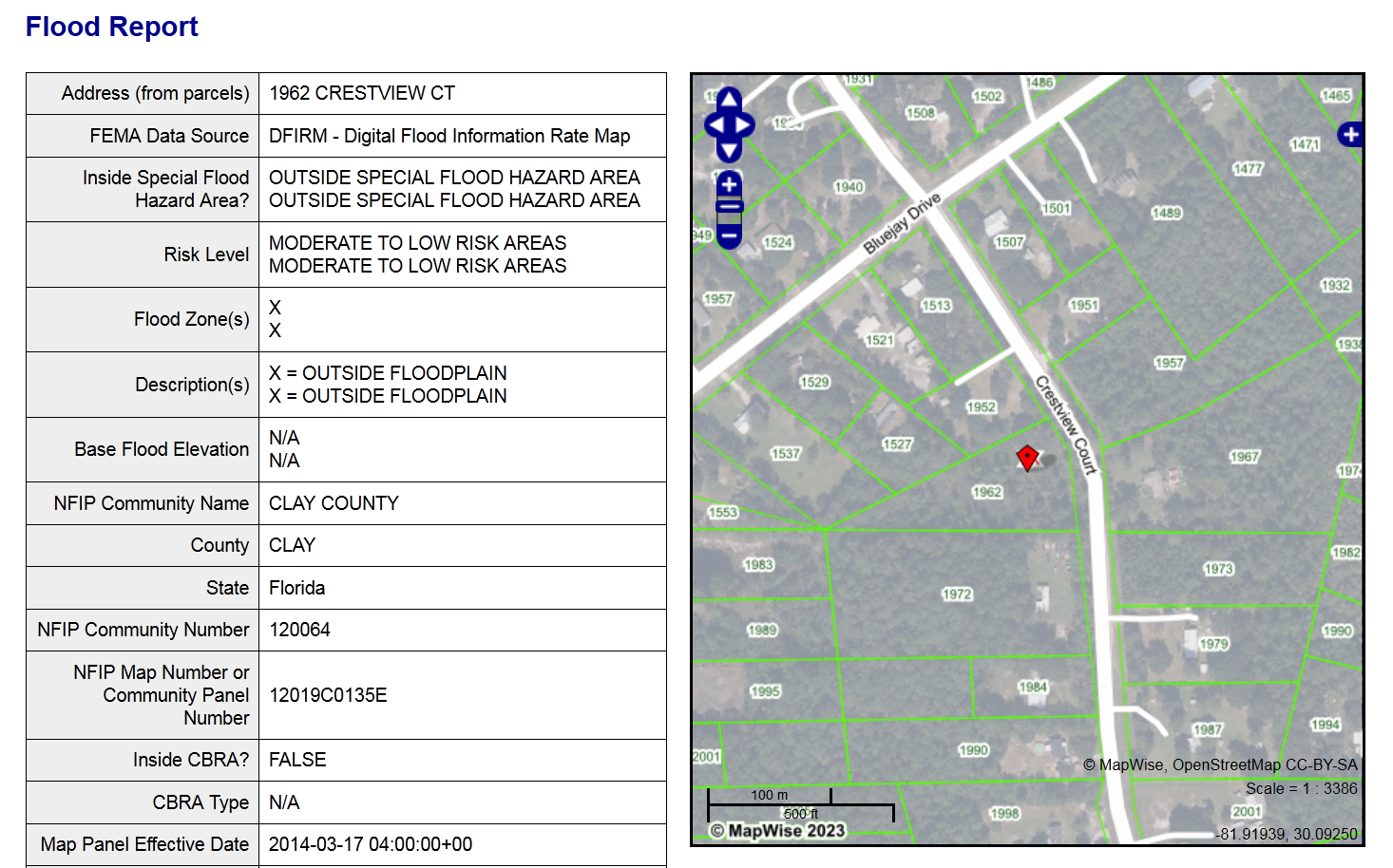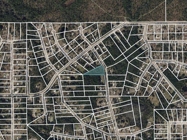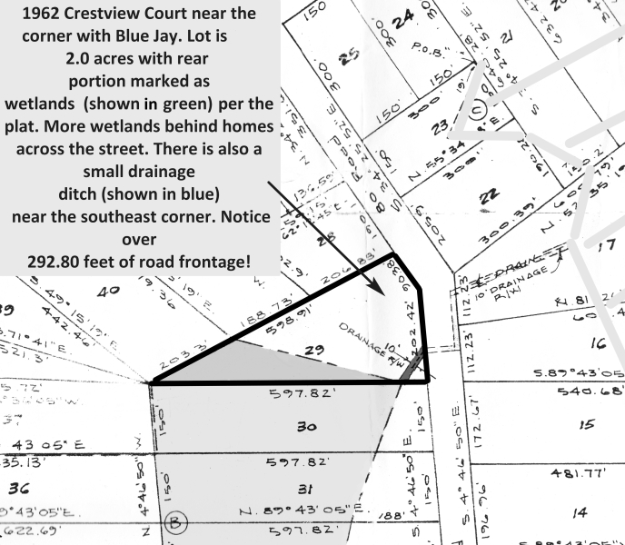 The property at 162 Crestview Court is 2.0 acres in size and located approximately 500 feet from the intersection with Blue Jay. The majority property is slash pine and bitter gallberry along with saw palmetto, broom sedge, bracken fern and catbrier. Soils were reviewed and found to be sandy in nature without hydric soil characteristics. No wetland hydrology indicators were found. This combination of vegetation and soils and lack of wetland hydrology indicates that this portion of the property is uplands. The uplands are estimated to be 1.35 acres which is more than large enough to build a home with a well and septic system.