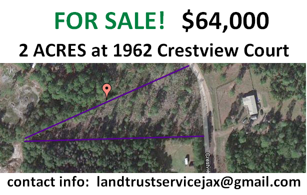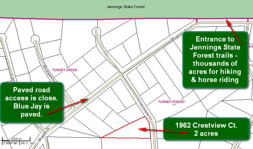 FOR SALE $64,000 for TWO ACRES on county maintained road. Build your house or place your mobile home. Zoning allows horses, and the lot is just around the corner from entrance to Jennings State Forest, with thousands of acres for hiking and horseback riding. Located on county maintained dirt road, only 550 feet from paved road access.