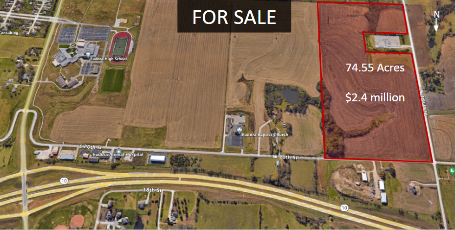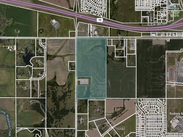 74 Acres of Development Ground in Eudora, KS. Adjacent to City Boundaries Earmarked for Residential Development. Five minutes from the 4 Billion Dollar Panasonic Plant (Opening 2025). Just South of K-10 Corridor Less Than One Mile From Recently Built Middle and High Schools. An Additional 54 Acres to the West can be Purchased for a Total of 128 +/- Acres of Congruent Development Ground.